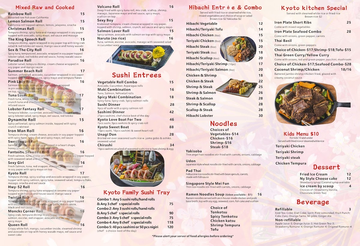 10oz hibachi steak, option for miso soup, house salad, clear soup, or no soup/salad. Substitutions include kani, seaweed, squid, or octopus salad.
