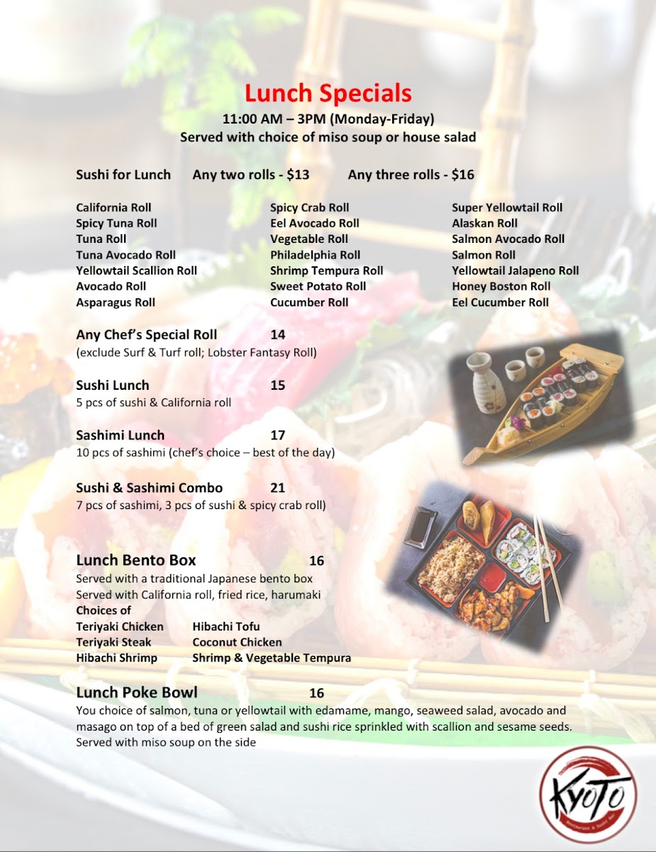 Chef special rolls selection: Choose from over 25 unique rolls including Golden California, Bagel, Godzilla, and more. Comes with a lunch side option: miso soup, house salad, clear soup, or a substitution with various salads.